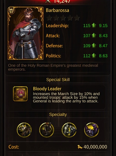 As one of the attacking mounted generals in Evony, Barbarossa has a total 123% mounted buffs, counting attack, defense and HP.