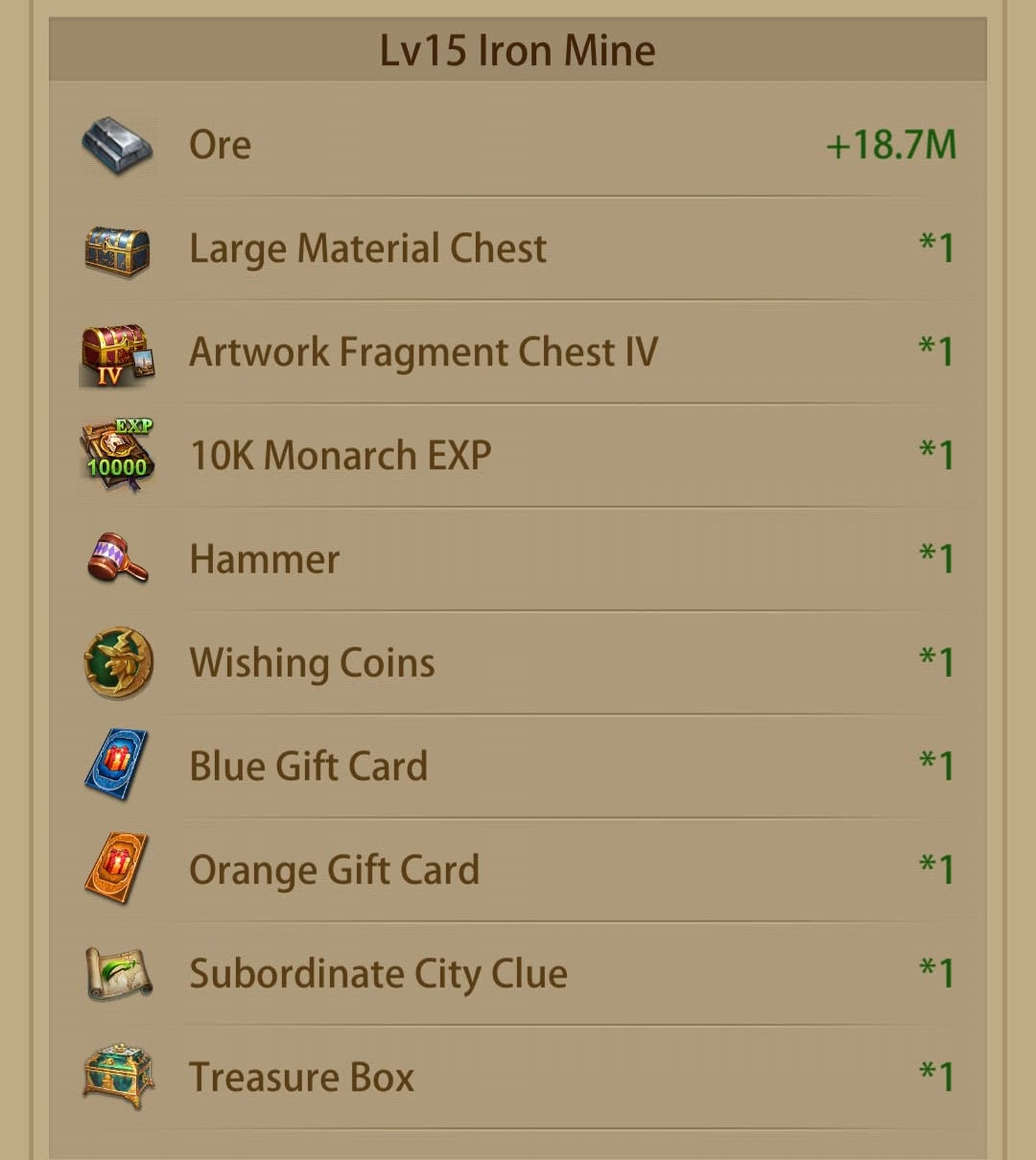 Lucky Box Ⅷ is composed from green, orange, red gift cards and can give the player 3 - 100K Stone Box, 10 - Refining Stone, 3 - 100K Ore Box, 500K Food Box or 3 - 60 Minute Speed Up.